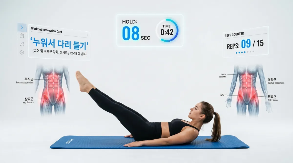 관절을 굽히지 않으면서 허벅지 근육만 집중적으로 사용하는 가장 안전한 운동입니다. 한쪽 다리를 일직선으로 펴고 발등을 몸 쪽으로 당긴 상태에서 15cm 정도 들어 올린 뒤 5~10초간 정지합니다.