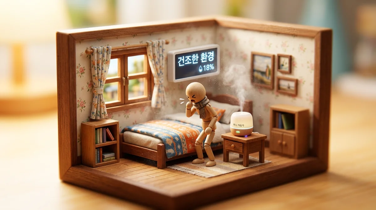 두 번째는 실내 습도 조절입니다. 가습기를 사용하여 실내 습도를 50~60%로 유지하세요. 특히 수면 중에는 입을 벌리고 자는 경우가 많아 기도가 더 건조해지므로 머리맡에 가습기를 두거나 젖은 수건을 걸어두는 것이 좋습니다.