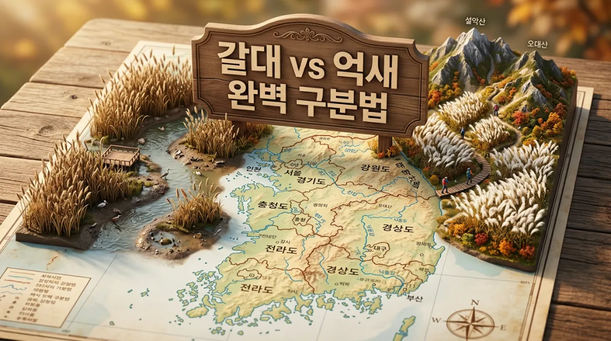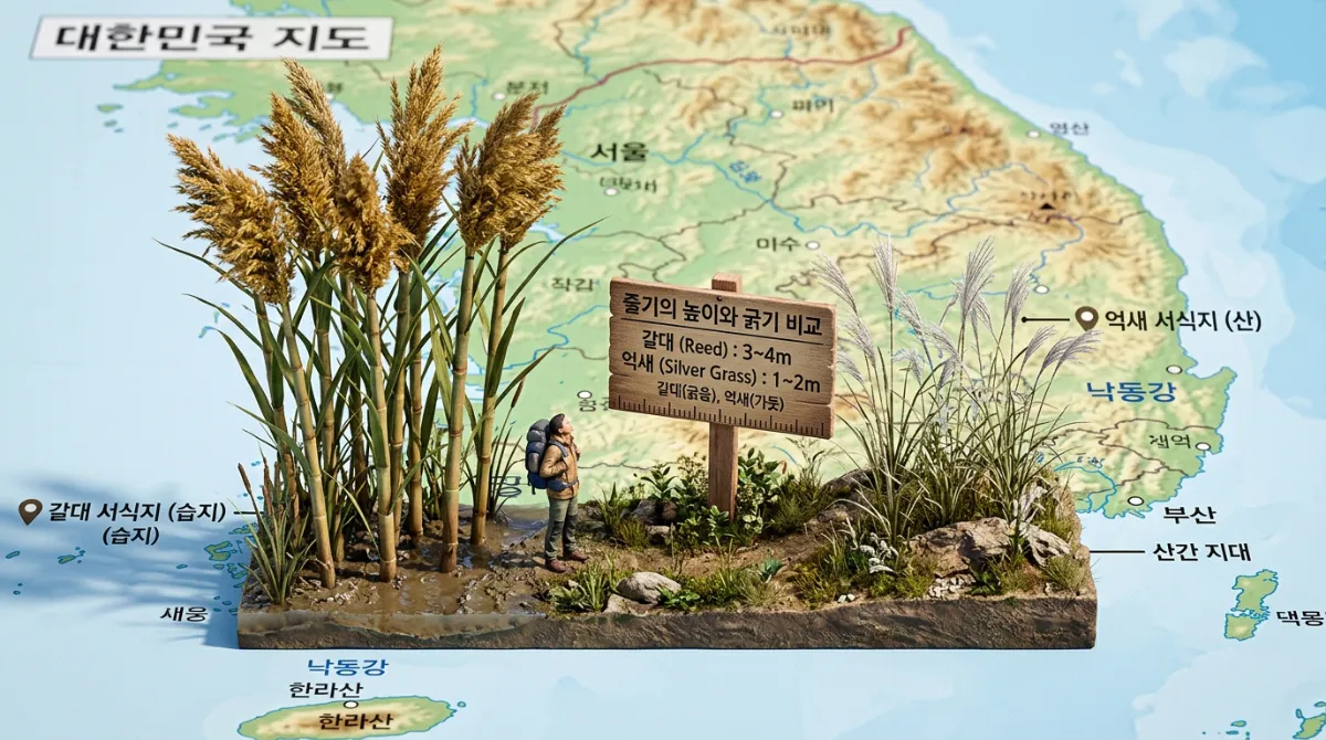 갈대와 억새를 구분하는 가장 빠르고 정확한 방법은 바로 '현재 내가 서 있는 곳'을 확인하는 것입니다. 이 두 식물은 선호하는 생육 환경이 완전히 극과 극이기 때문이죠.