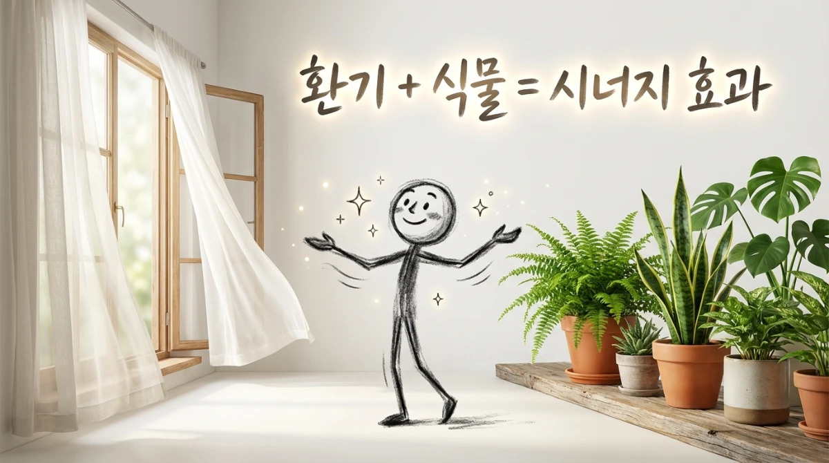시너지 효과 만들기: 식물만으로 공기 정화 100%는 어렵습니다. 규칙적인 환기 + 공기 정화 식물의 조합이 가장 현실적이고 효과적인 방법입니다. 가끔 창문을 열어 신선한 공기를 순환시켜주면 식물도 더 건강하게 자라고 실내 공기질도 한층 더 좋아집니다.