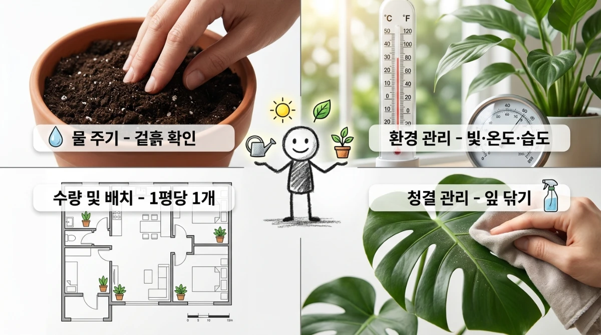 아무리 공기정화 능력이 뛰어나도 식물이 건강해야 그 효과를 제대로 볼 수 있겠죠? 초보 식집사도 쉽게 따라 할 수 있는 기본적인 관리 팁을 알려드릴게요.