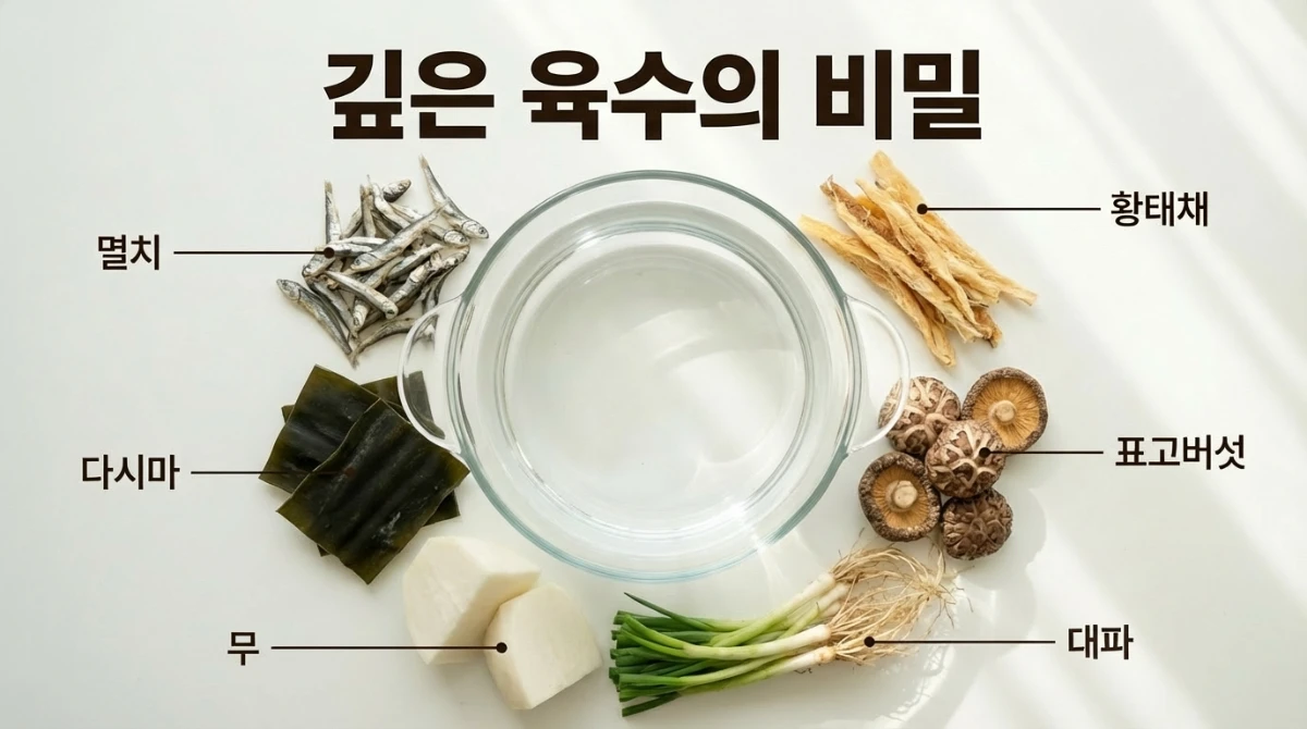 3. 깊은 육수 비결: 멸치 다시마 육수에 무, 대파 뿌리, 황태채를 더해 감칠맛을 끌어올리세요.