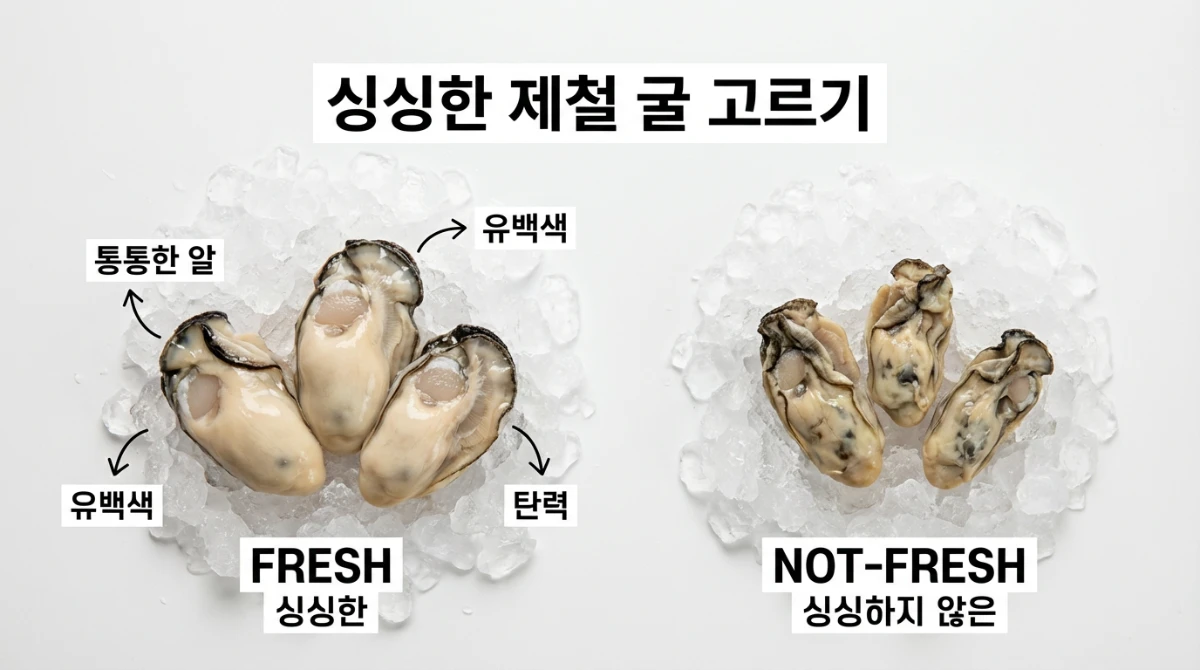 1. 제철 굴 선택: 통통하고 유백색을 띠는 신선한 굴이 맛의 핵심입니다.