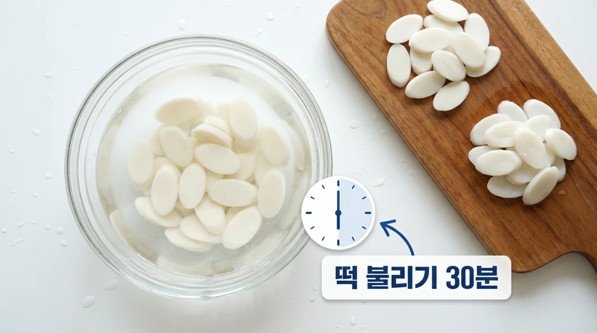 | 1. 떡국 떡은 찬물에 30분 정도 불려 준비합니다. (딱딱한 정도에 따라 조절) |