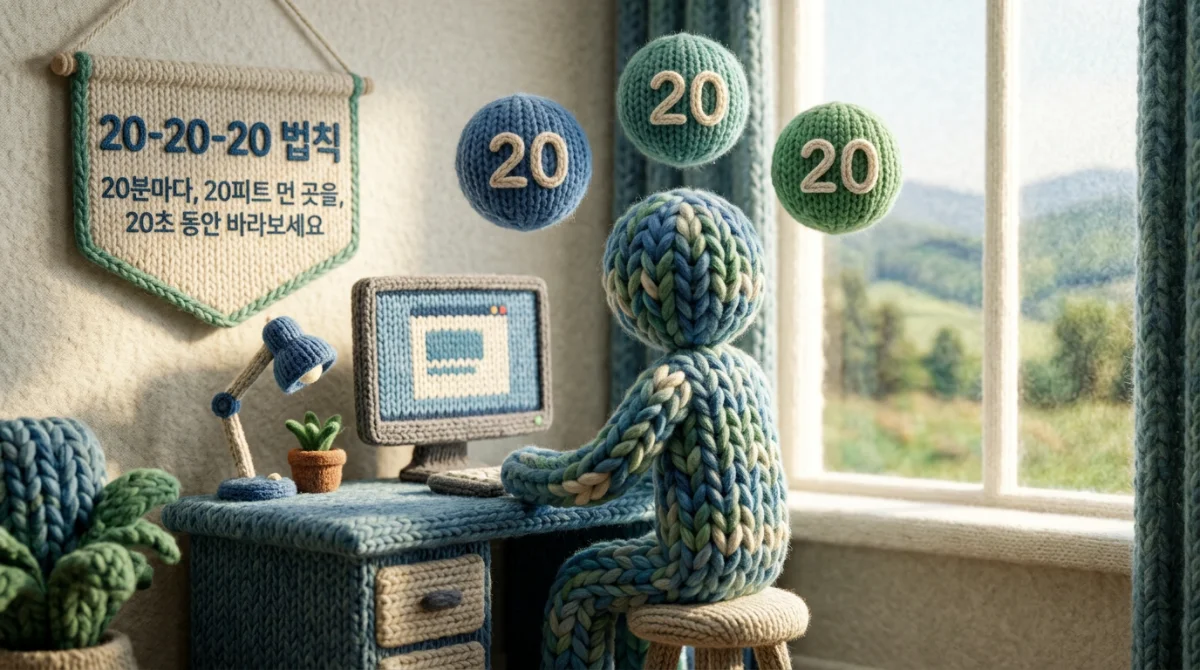 눈썹 앞머리 푹 들어간 곳(찬죽혈)과 눈동자 바로 아래 광대뼈가 시작되는 지점(승읍혈)을 검지와 중지를 이용해 가볍게 꾹꾹 눌러주세요. 단, 절대 안구를 직접 압박해선 안 되며 뼈 주변을 부드럽게 원을 그리듯 마사지해 주는 것이 핵심입니다. 세 번째로, 업무 중이라면 반드시 '20-20-20 법칙'을 실천하세요.