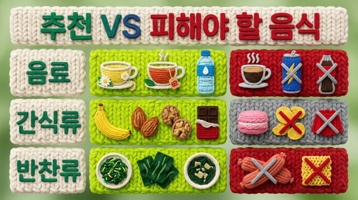 하지만 아무리 좋은 영양소를 섭취해도, 밑 빠진 독에 물 붓기처럼 영양소를 줄줄 새게 만드는 음식들을 피하지 않으면 소용이 없습니다. 과도한 당분(디저트, 탄산음료)과 나트륨, 그리고 카페인은 체내에 저장된 마그네슘과 수분을 소변으로 몽땅 배출시켜 버립니다. 눈 떨림이 심한 며칠 동안이라도 커피 대신 디카페인 차나 따뜻한 물을 자주 마셔 수분을 보충해 주는 것이 회복을 훨씬 앞당길 수 있는 지름길입니다.