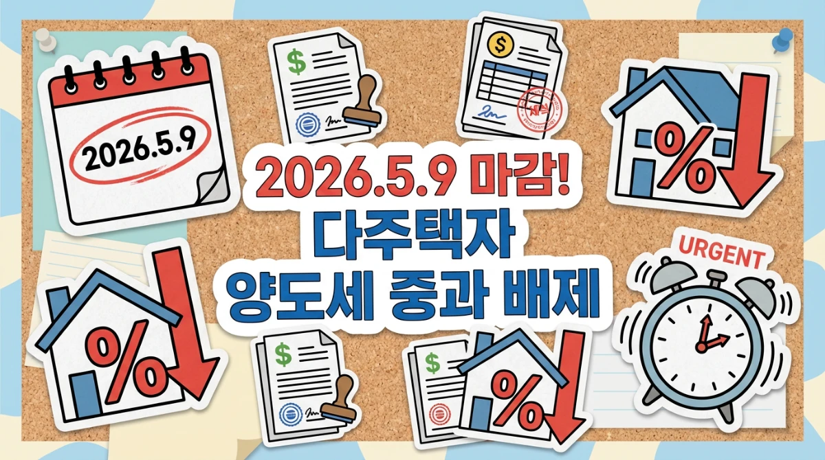⚠️ 주의: 중과 배제가 된다고 하더라도, 취득세나 종합부동산세 등 다른 세금 부담은 여전히 존재합니다. 특히 2026년 5월 9일이라는 기한이 정해진 만큼, 이 기한을 넘기면 막대한 세금 차이가 발생할 수 있습니다. 시장 상황과 매수자의 수요를 함께 고려하여, 늦어도 2026년 초까지는 충분한 시간을 가지고 매도 계획을 세우는 것이 현명합니다.