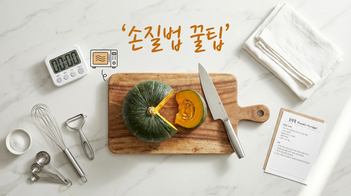 단호박은 껍질이 단단해서 손질하기 어렵다고 생각하실 수 있어요. 전자레인지에 3~5분 정도 돌리면 껍질이 부드러워져 훨씬 쉽게 자를 수 있답니다. 씨를 제거한 후 요리 목적에 맞게 썰어주세요.