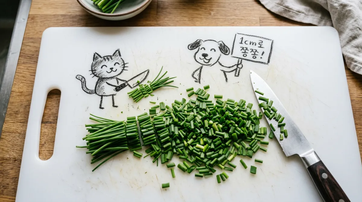 - 달래 썰기: 물기를 탈탈 턴 달래를 도마에 올리고, 먹기 좋은 1~1.5cm 길이로 쫑쫑 썰어줍니다. 알뿌리가 너무 큰 것은 칼등으로 살짝 으깬 뒤 썰어주면 향이 더욱 진하게 우러납니다.