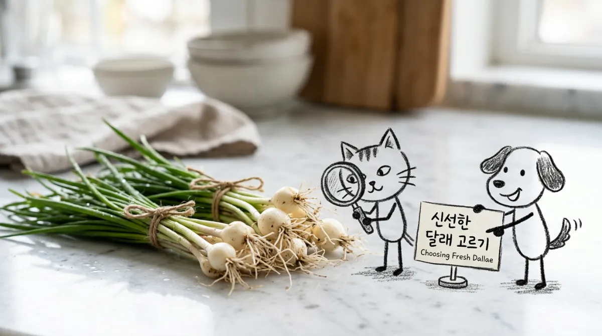 달래를 고를 때는 알뿌리가 굵고 둥글며, 잎이 진한 녹색을 띠는 것이 좋습니다. 줄기가 너무 길게 자란 것은 질길 수 있으니 적당한 길이의 달래를 선택해 주세요. 뿌리 부분에서 짙은 향기가 날수록 맛이 깊고 좋습니다.