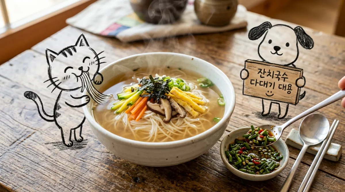 뜨끈한 멸치 육수를 우려낸 잔치국수에 달래장을 한 스푼 풀어보세요.