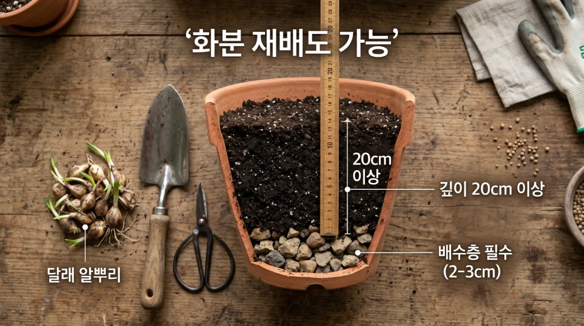 토양은 배수가 잘 되는 사질양토가 이상적이에요. 물이 고이는 땅에서는 알뿌리가 썩기 쉬워요. 화분 재배도 충분히 가능하고, 깊이 20cm 이상 되는 화분이면 됩니다.