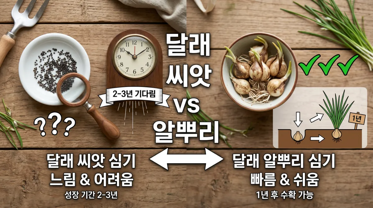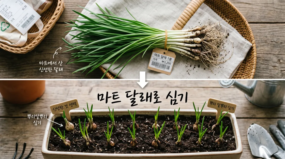 신선한 달래를 사서 뿌리 부분 알뿌리를 흙에 심으면 실제로 잘 자랍니다. 단, 너무 오래된 달래나 냉동 보관된 것은 활착이 어려우니 신선한 것을 고르세요. 텃밭 초보에게는 이 방법이 가장 쉬운 첫 시도예요.
