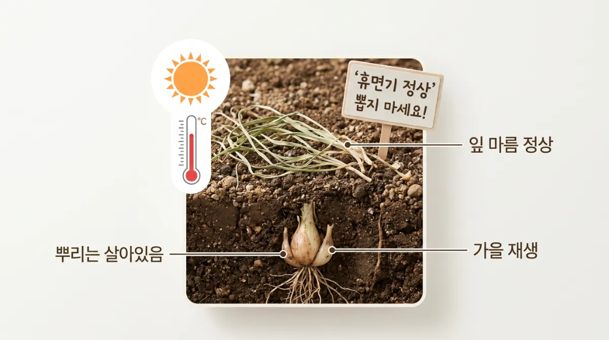 달래는 여름이 되면 잎이 말라 들어가는 휴면기에 들어갑니다. 이걸 보고 "죽었나?" 싶어서 뽑아버리는 경우가 종종 있는데, 뿌리는 살아있으니 그냥 두면 돼요. 반그늘에서 여름을 나게 해주면 가을부터 다시 싹이 올라옵니다.