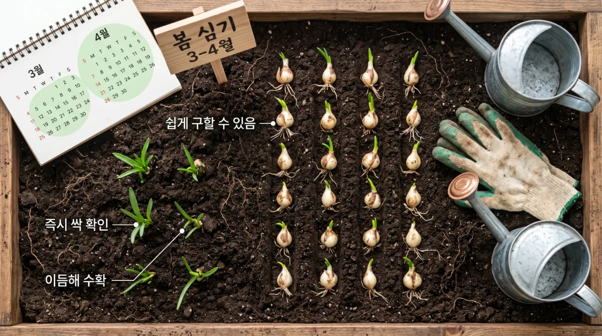 땅이 녹기 시작하면 바로 심을 수 있어요. 봄에 심으면 그해 여름 동안 뿌리가 자리를 잡고, 이듬해 봄에 수확할 수 있습니다. 씨앗이 아닌 알뿌리(인편)를 심는 경우라면 봄 심기도 충분히 가능해요.