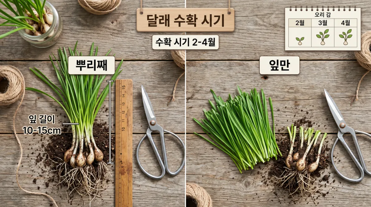 수확은 이른 봄 2~4월이 가장 좋은 시기입니다. 잎 길이가 10~15cm 정도 자랐을 때 뿌리째 캐거나, 잎만 잘라서 수확할 수 있어요. 잎만 잘라도 뿌리가 남아 이듬해에 또 올라오기 때문에 한 번 자리를 잡으면 매년 수확이 가능합니다.