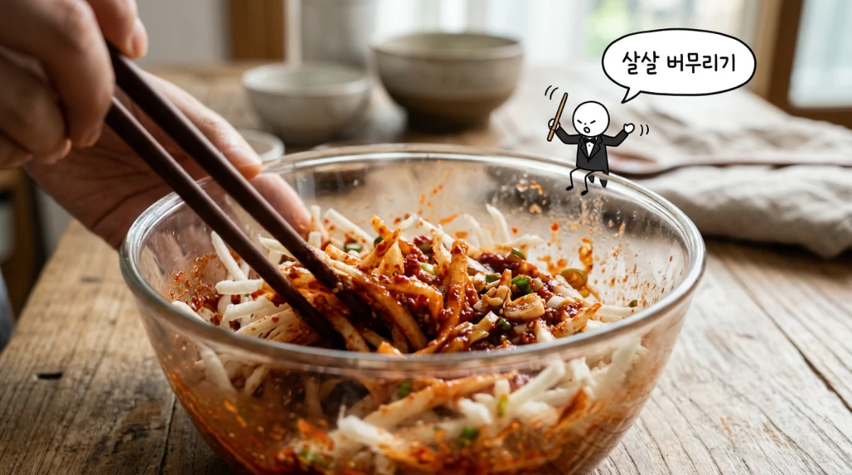 준비된 더덕과 숙성된 양념장을 버무리는 단계입니다. 여기서 초보자들이 많이 하는 실수 중 하나가 김치를 버무리듯 힘을 주어 꽉꽉 주무르는 것인데요. 더덕을 너무 세게 치대면 아삭한 식감이 사라지고 질겨지며, 더덕 안에서 수분이 빠져나와 나중에 양념이 한강처럼 변해버립니다.