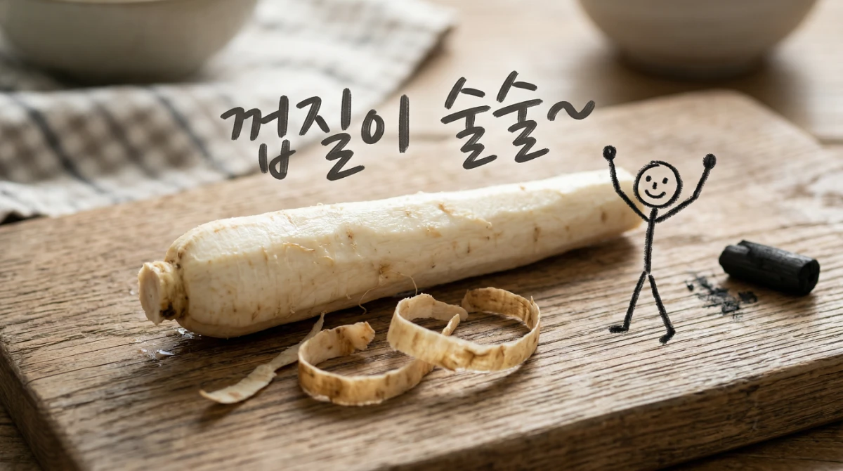 더덕 요리를 포기하게 만드는 가장 큰 원인은 바로 '껍질 까기'입니다. 끈적한 사포닌 성분 때문에 손은 엉망이 되고, 껍질은 잘 벗겨지지 않죠. 하지만 이 방법 하나만 알면 사과 깎듯 쉽게 더덕을 손질할 수 있습니다. 먼저 흙이 묻은 더덕을 흐르는 물에 깨끗하게 씻어줍니다. 칫솔이나 전용 솔을 이용해 주름 사이사이에 낀 흙을 제거해 주세요.