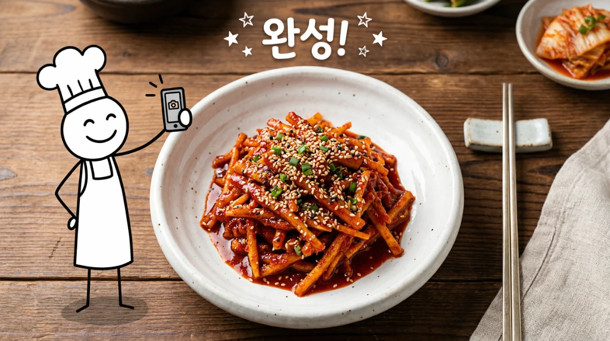 간을 한 번 보고 남은 양념장으로 입맛에 맞게 조절합니다. 마지막으로 참기름을 한 바퀴 빙 둘러 고소함을 더하고, 통깨를 솔솔 뿌려 마무리하면 식당 부럽지 않은 완벽한 더덕무침이 완성됩니다.
