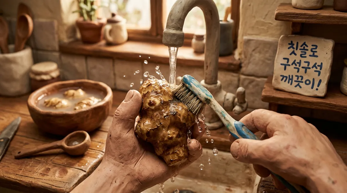 돼지감자는 굴곡이 많아서 대충 씻으면 틈새에 흙이 그대로 남아있을 수 있습니다. 여기서 중요한 팁 하나!