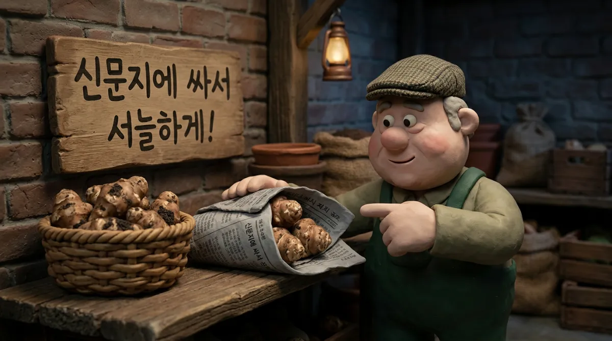 생으로 보관할 때는 흙이 묻은 상태 그대로 신문지에 싸서 서늘한 곳에 두는 것이 정석입니다.