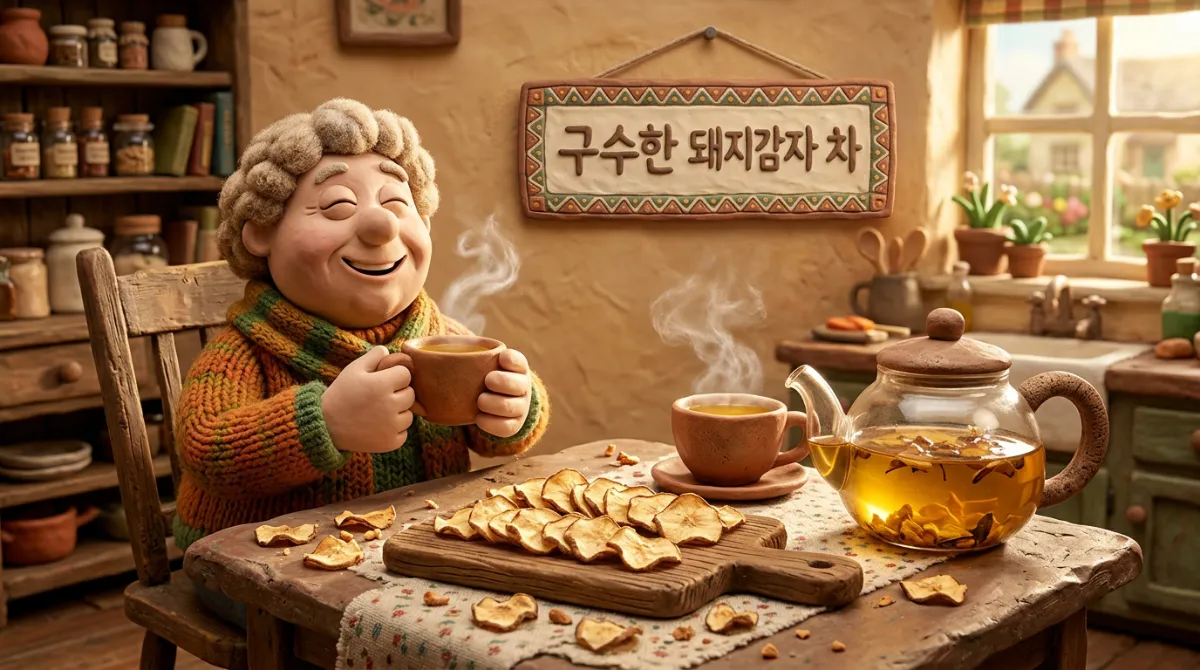가장 대중적이고 편하게 드시는 방법입니다. 깨끗이 씻은 돼지감자를 슬라이스해서 바짝 말린 뒤, 팬에 살짝 볶아주세요. 뜨거운 물에 2~3조각만 넣어도 보리차보다 훨씬 구수한 향이 납니다. 식후 혈당 조절용으로 최고예요!