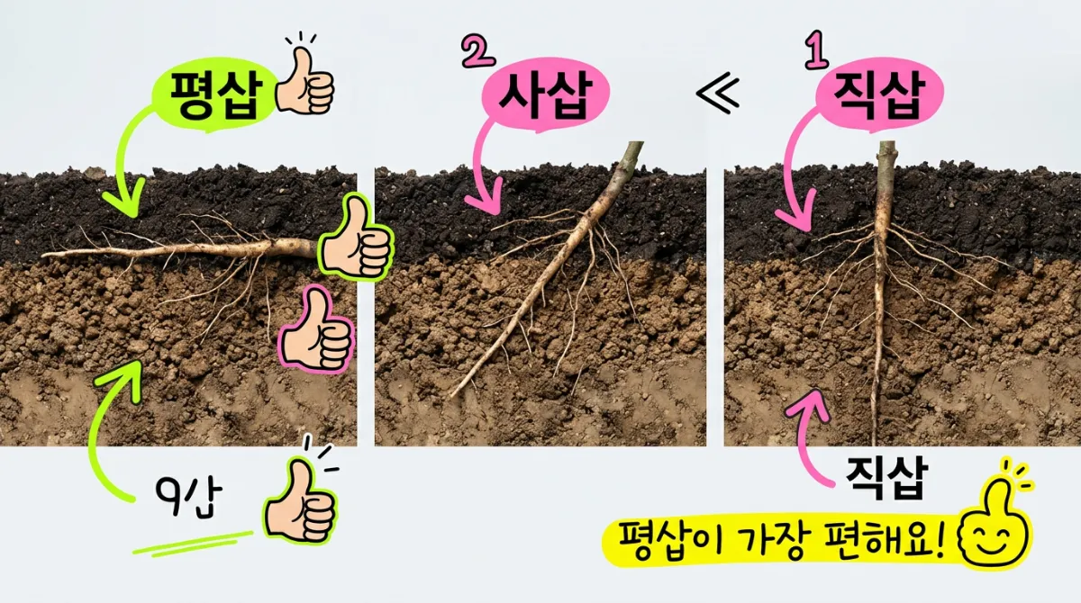 3단계. 삽목 방법 선택: 꽂는 방법은 크게 평삽(수평으로 눕혀 묻기), 사삽(비스듬히 꽂기), 직삽(수직으로 꽂기) 세 가지가 있어요. 발아율과 득묘율은 비슷하지만, 작업 편의성 면에서 평삽이 가장 유리합니다.