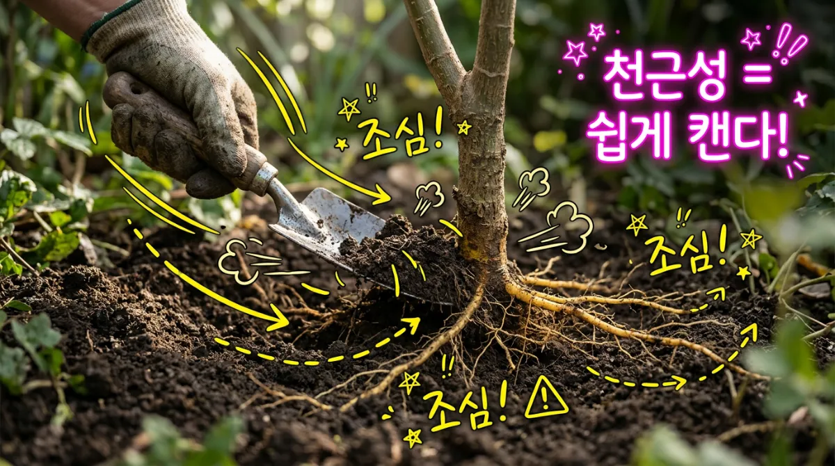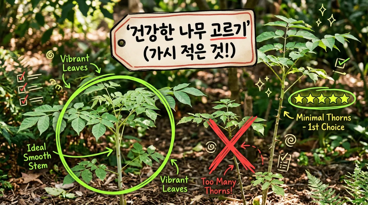 1단계. 모수 선택과 뿌리 캐기: 1~3년생의 건강한 두릅나무를 골라요. 병해가 없고, 가시가 적은 계통이면 더 좋습니다.