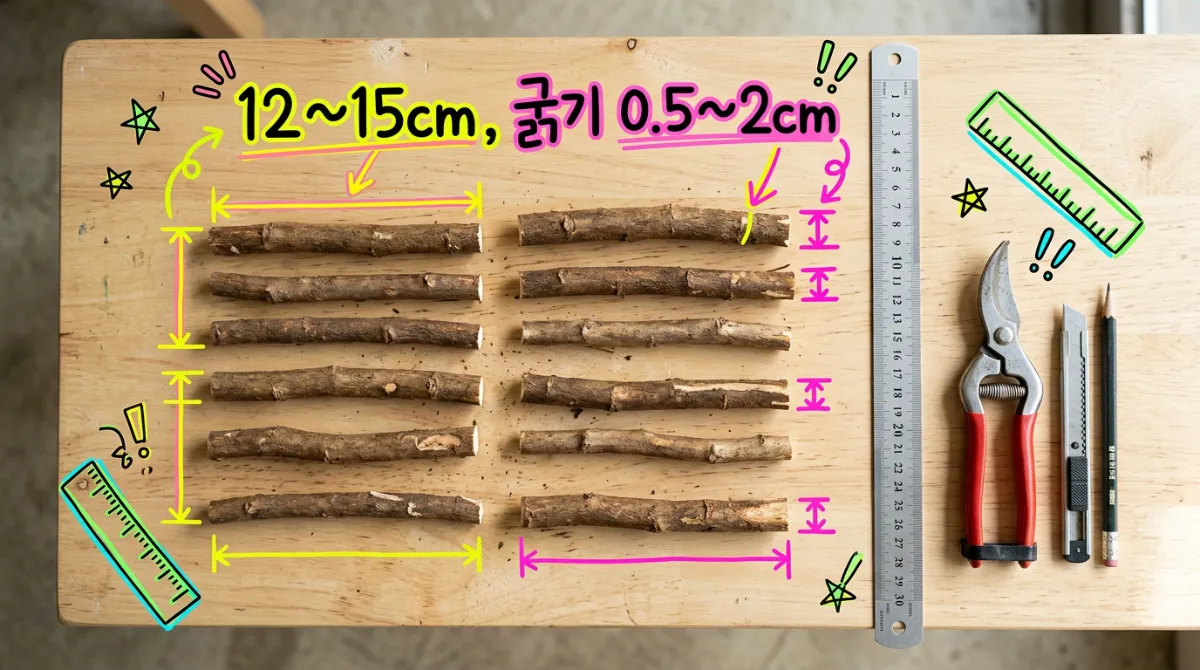 2단계. 삽수 조제: 캐낸 뿌리를 길이 12~15cm, 굵기 0.5~2cm 정도로 잘라요.