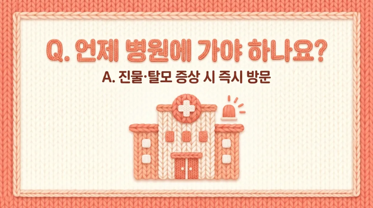 A. 진물이 나거나, 붉은 반점이 생기고, 머리카락이 눈에 띄게 빠진다면 즉시 피부과를 방문해야 합니다.