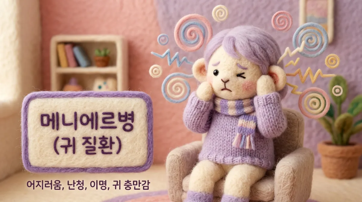 ④ 메니에르병 — 내이(속귀)의 림프액 압력 이상으로 발생하는 질환이에요. 회전성 어지럼증이 수십 분~수 시간 지속되면서 이명(귀울림), 청력 감소, 귀 먹먹함이 함께 나타나는 것이 특징입니다. 증상이 반복된다면 반드시 이비인후과 진료가 필요해요.