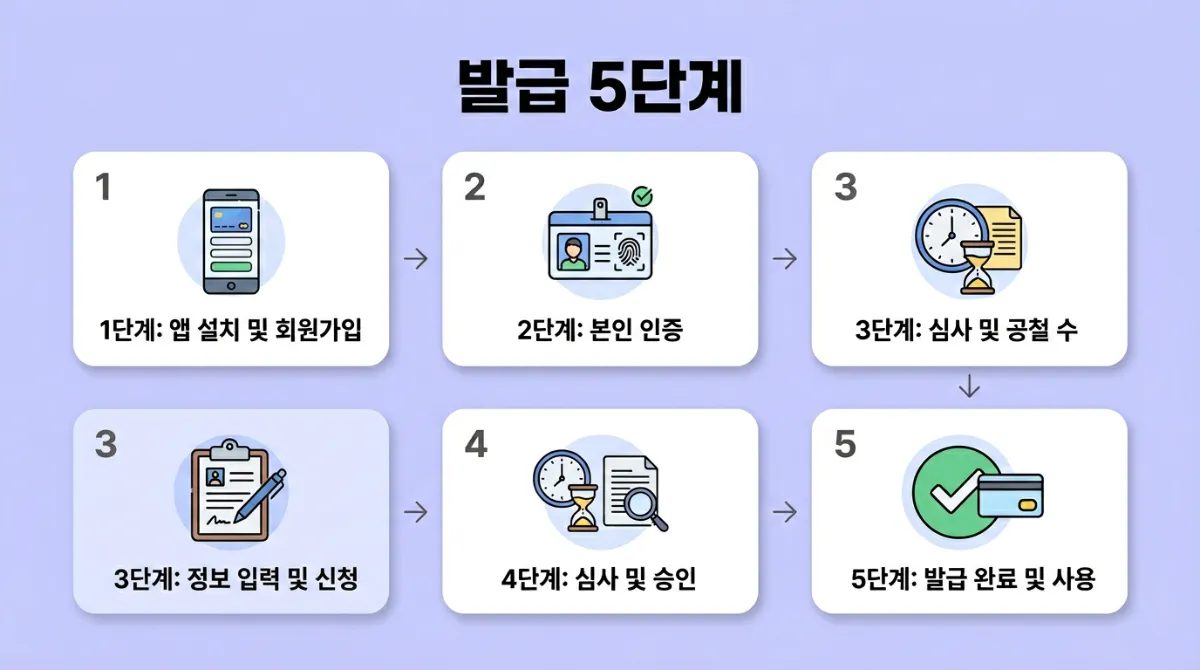처음 발급받는 분이라면 아래 순서대로 진행하면 됩니다. 어렵지 않아요. 카드 신청하고 앱에서 등록하는 두 단계가 전부입니다.