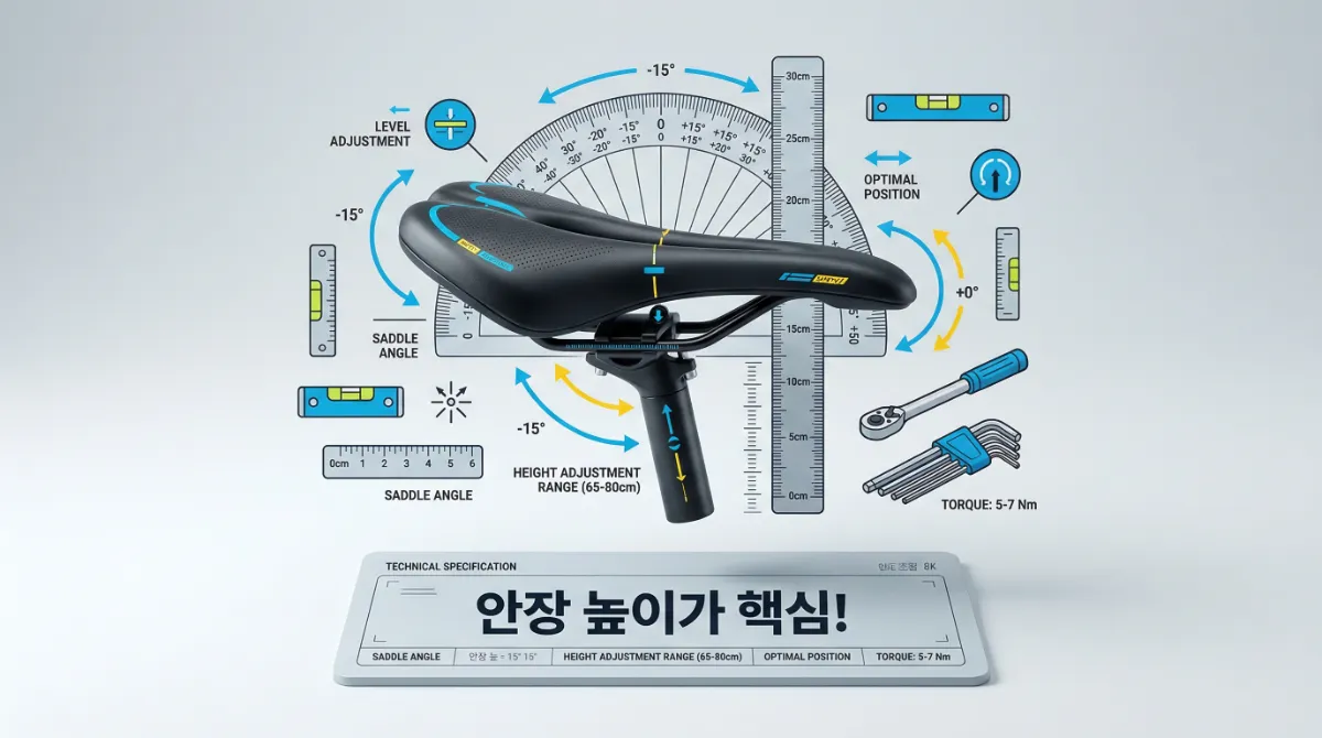 페달이 가장 아래에 있을 때 무릎이 10~15도 정도 살짝 굽혀지는 높이가 무릎 슬개골에 가해지는 압력을 최소화할 수 있는 가장 이상적인 위치입니다.