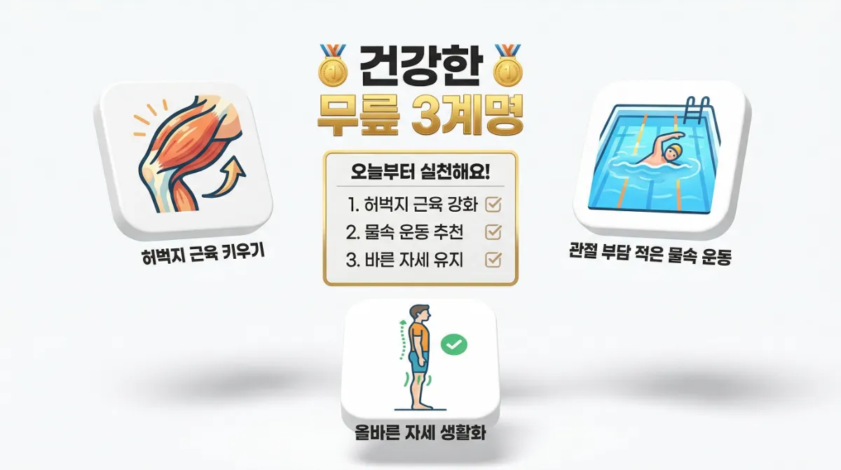 오늘 함께 살펴본 무릎 관절 건강 관리의 핵심 포인트입니다.