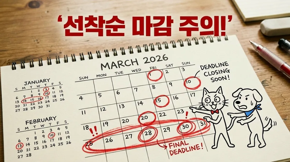 반려동물 지원 사업 대부분은 연간 예산 소진 시 조기 마감됩니다. 특히 중성화 수술 지원과 의료비 지원은 봄철(3~5월)에 신청이 몰리는 경향이 있어요. 연초에 거주지 구청 공지를 확인해 두고, 모집 공고가 뜨자마자 신청하는 게 유리합니다.