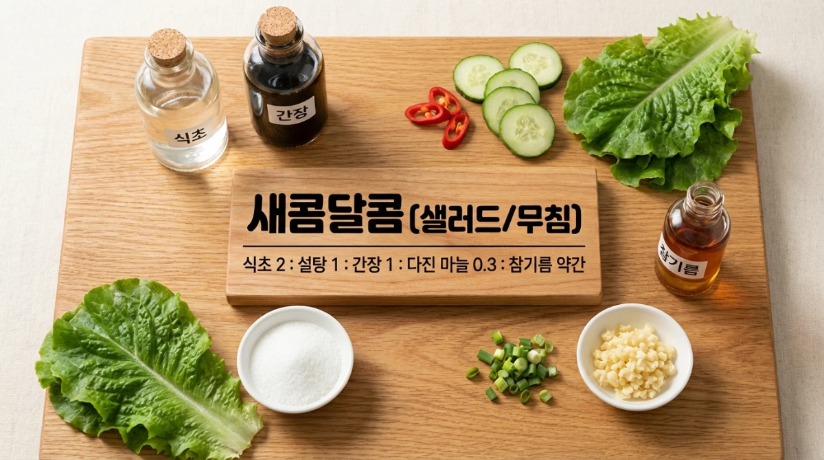 - 새콤달콤 (샐러드/무침): 식초 2 : 설탕 1 : 간장 1 : 다진 마늘 0.3 : 참기름 약간
