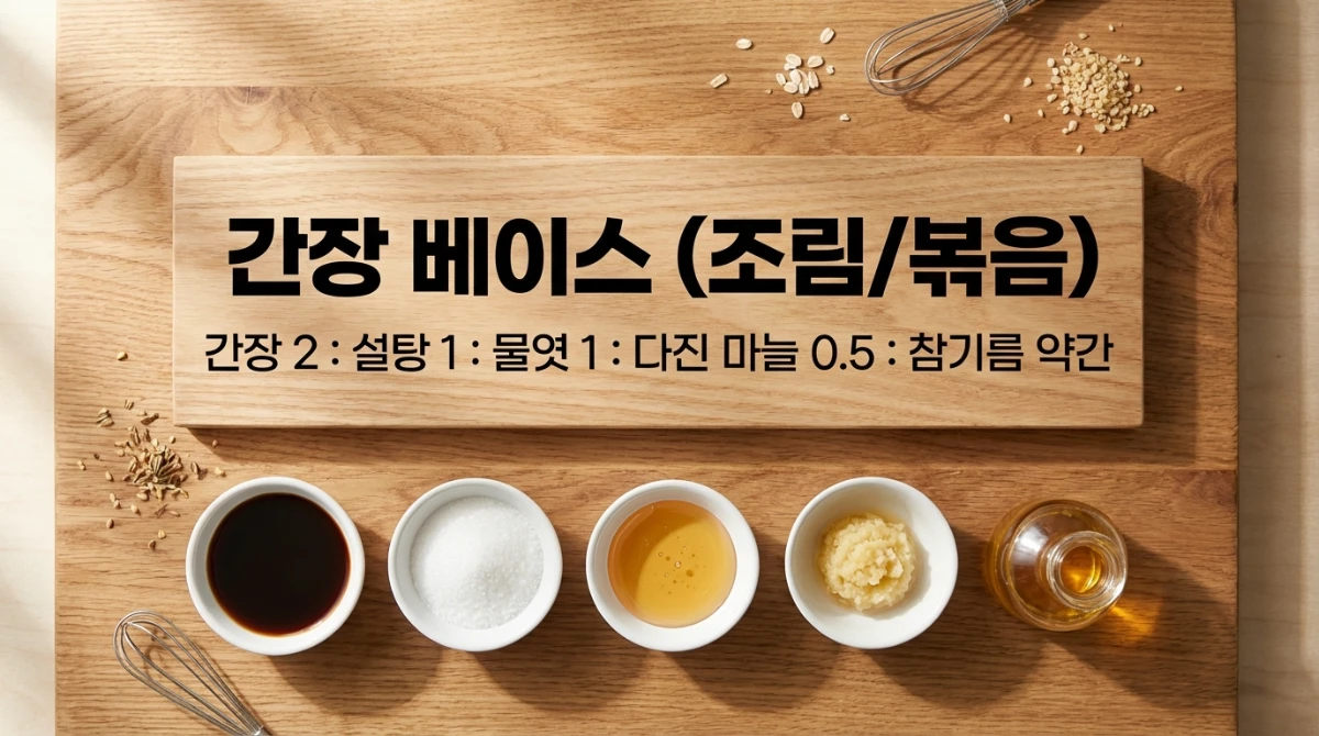 - 간장 베이스 (조림/볶음): 간장 2 : 설탕 1 : 물엿 1 : 다진 마늘 0.5 : 참기름 약간