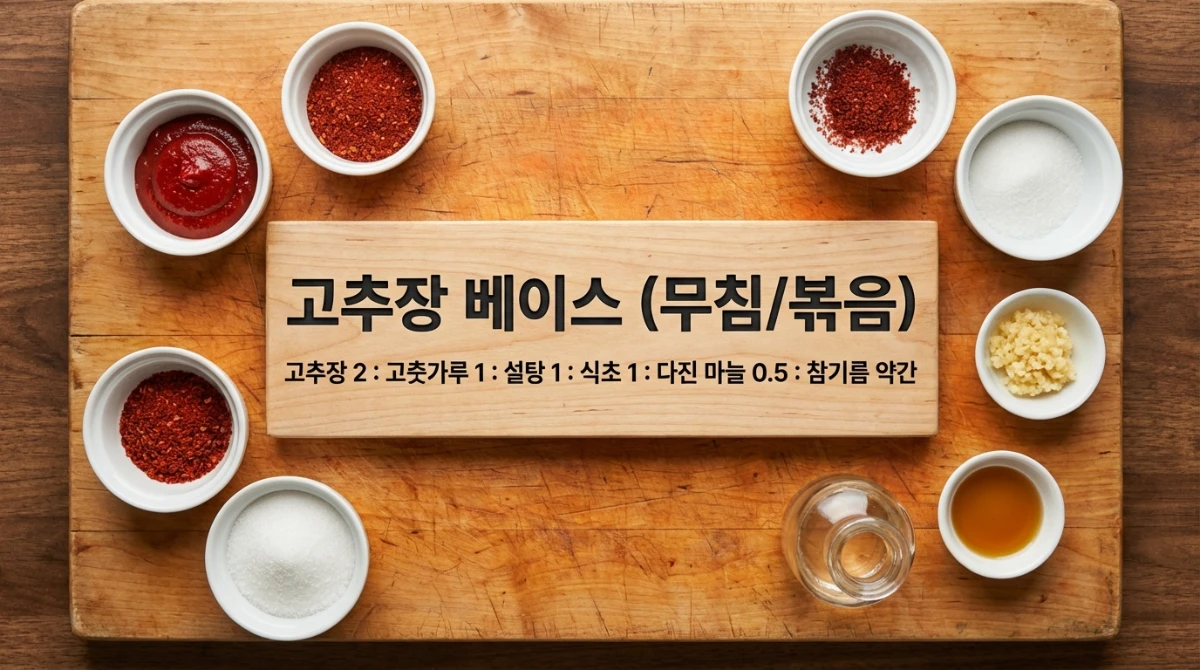 - 고추장 베이스 (무침/볶음): 고추장 2 : 고춧가루 1 : 설탕 1 : 식초 1 : 다진 마늘 0.5 : 참기름 약간