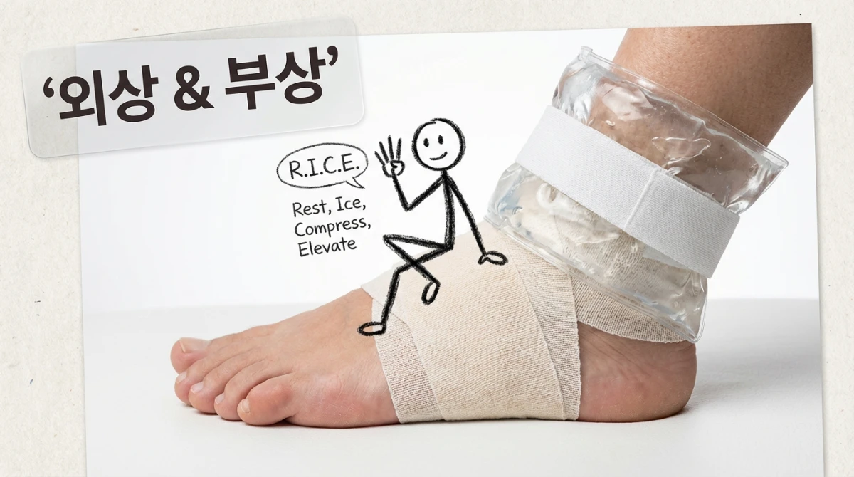 - 냉찜질 (Ice): 얼음 주머니 등으로 15~20분간 냉찜질을 하여 부기와 통증을 줄입니다.