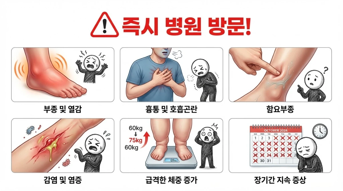 ✅ 한쪽 발만 붓거나, 통증, 열감, 붉은 기가 심하거나, 호흡 곤란 등이 동반되면 즉시 병원을 방문해야 합니다.