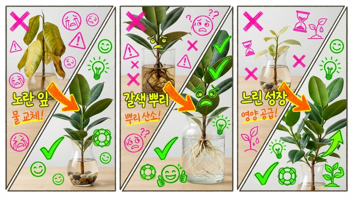 | 뿌리가 갈색으로 변하거나 썩음 | 산소 부족, 물 교체 불량, 혹은 너무 많은 비료가 원인일 수 있습니다. 물을 자주 갈아주고, 뿌리를 부드럽게 세척한 후 썩은 부분은 깨끗하게 제거해주세요. |