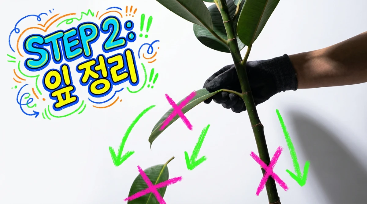 - 하부 잎 정리: 물에 잠길 부분의 잎은 모두 제거해주세요. 잎이 물에 잠기면 썩을 수 있기 때문입니다.