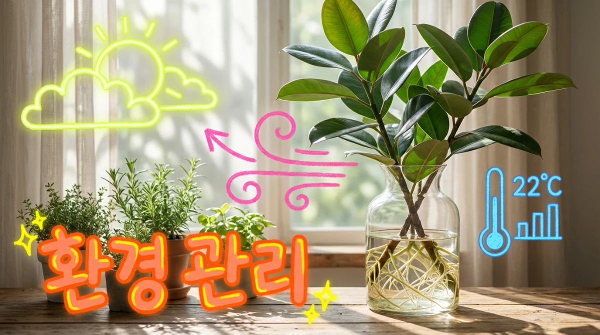 뱅갈고무나무 수경재배가 잘 정착되었다면, 이제 꾸준한 관리가 필요합니다. 몇 가지 핵심 팁만 기억하시면 여러분의 뱅갈고무나무는 흙 없이도 폭풍 성장할 거예요!
