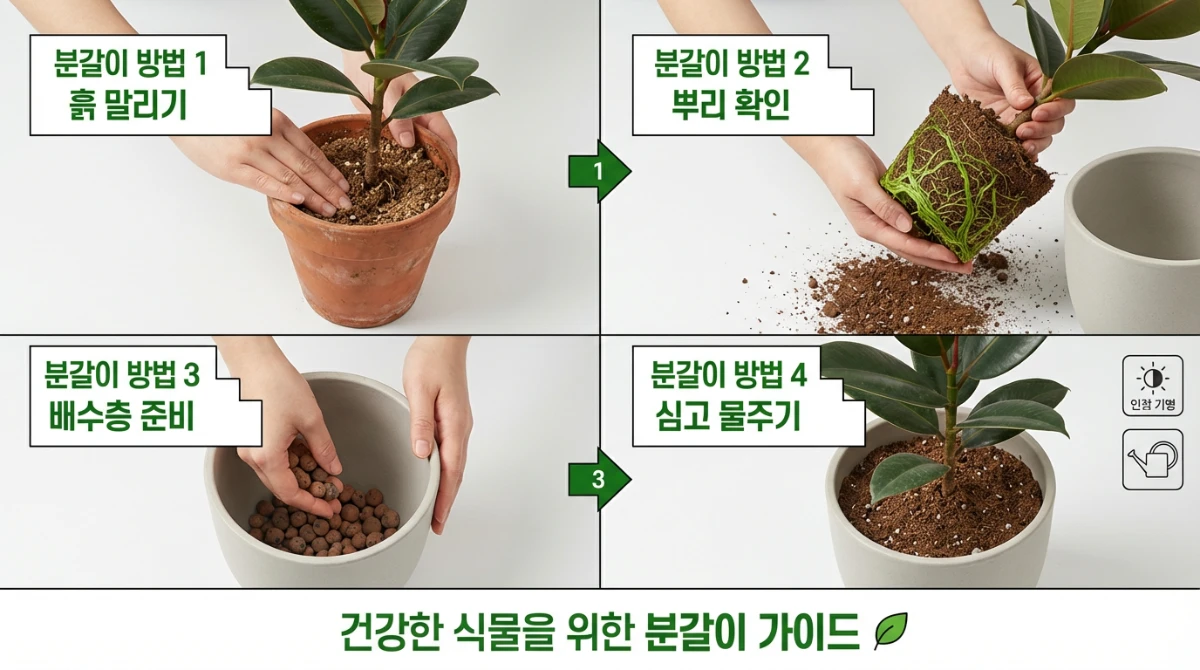 뿌리가 화분 가득 차 더 이상 자랄 공간이 없을 때 분갈이는 필수적이지만, 이 과정에서 뿌리가 손상되거나 새로운 흙 환경에 적응하지 못하면 뱅갈고무나무는 큰 스트레스를 받습니다.