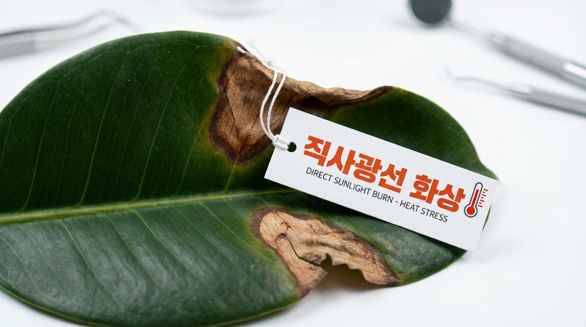 강렬한 직사광선은 뱅갈고무나무 잎에 화상을 입힐 수 있습니다. 특히 여름철 한낮의 뜨거운 햇볕은 잎을 타게 만들고, 결국 떨어지게 해요.