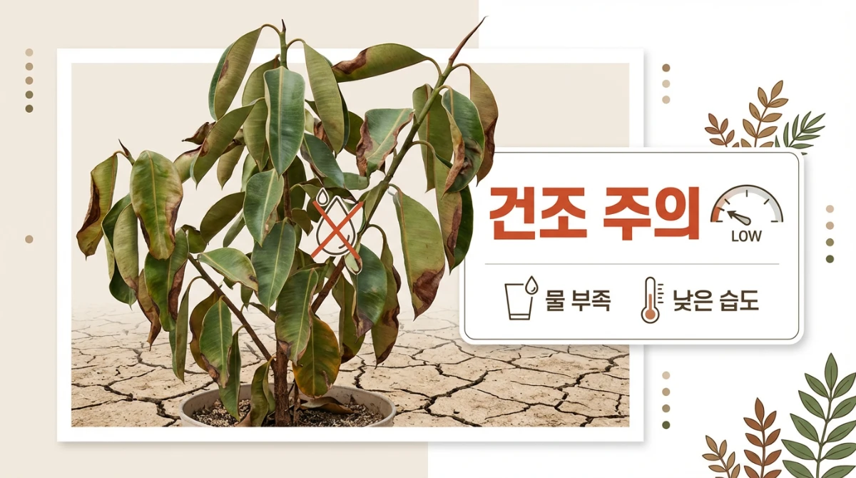 해결책: 흙이 마르면 바로 물을 충분히 주세요. 물을 줄 때는 화분 밑으로 물이 흘러나올 때까지 흠뻑 주는 것이 좋습니다. 또한 건조한 겨울철에는 가습기를 틀어주거나 잎에 스프레이를 해주는 등 실내 습도를 50~60%로 유지해주는 것이 큰 도움이 됩니다.
