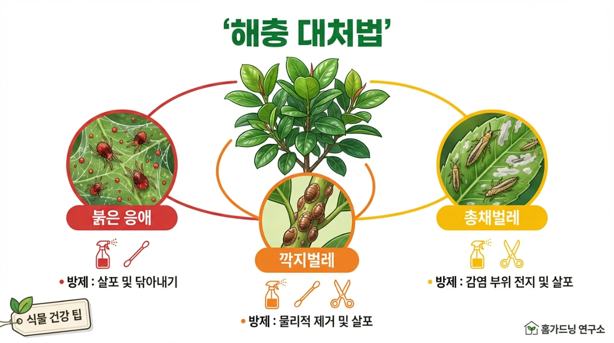 | 깍지벌레 | 솜 덩어리 같은 흰색 알갱이, 끈적이는 분비물 | 면봉으로 제거, 친환경 살충제, 심한 경우 가지치기 |