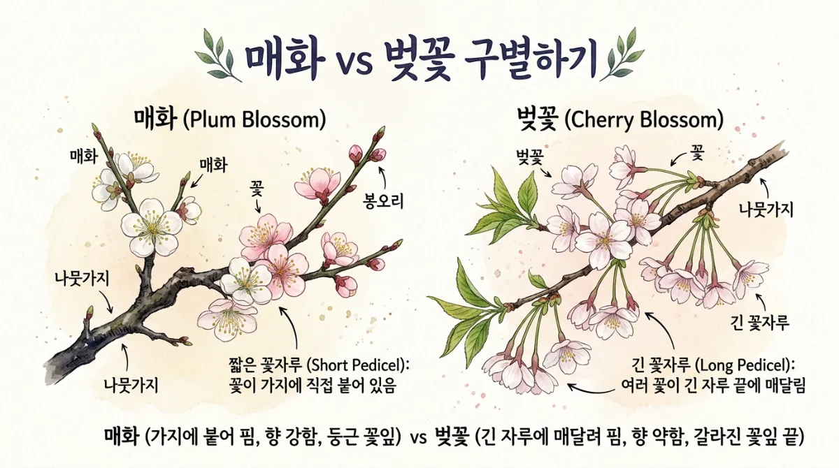 A. 가지에 붙은 모습을 보세요! 매화는 가지에 껌딱지처럼 착 달라붙어서 피고, 벚꽃은 꽃자루(줄기)가 길게 나와서 조롱조롱 매달려 피어납니다. 또한 벚꽃잎 끝에는 살짝 브이(V) 자로 파인 홈이 있습니다.