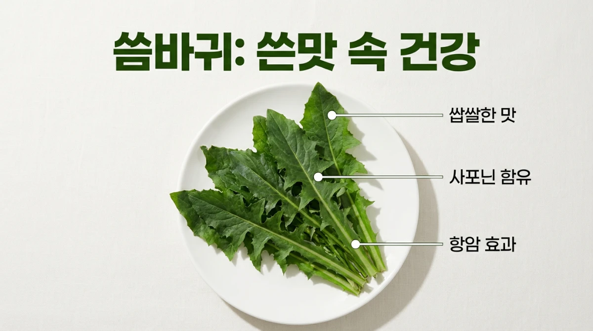 쓴맛이 강해 호불호가 갈리기도 하지만, 씀바귀는 그 쌉쌀함 속에 엄청난 건강 효능을 숨기고 있는 보물 같은 봄나물입니다. 항암 효과와 면역력 강화에 탁월하며, 특히 인삼의 주요 성분인 사포닌이 함유되어 있어 '천연 인슐린'이라고 불리기도 합니다.