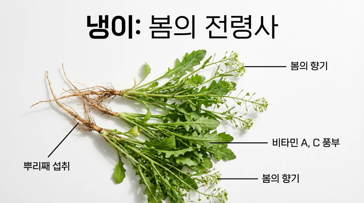 봄이 왔음을 가장 먼저 알리는 냉이는 특유의 쌉쌀한 맛과 향이 일품이죠. 뿌리째 뽑아 먹는 냉이는 비타민 A와 C, 칼슘, 철분 등이 풍부하여 춘곤증을 이기는 데 도움을 준답니다. 따뜻한 밥에 냉이 된장국 한 그릇이면 그 어떤 보약도 부럽지 않아요.
